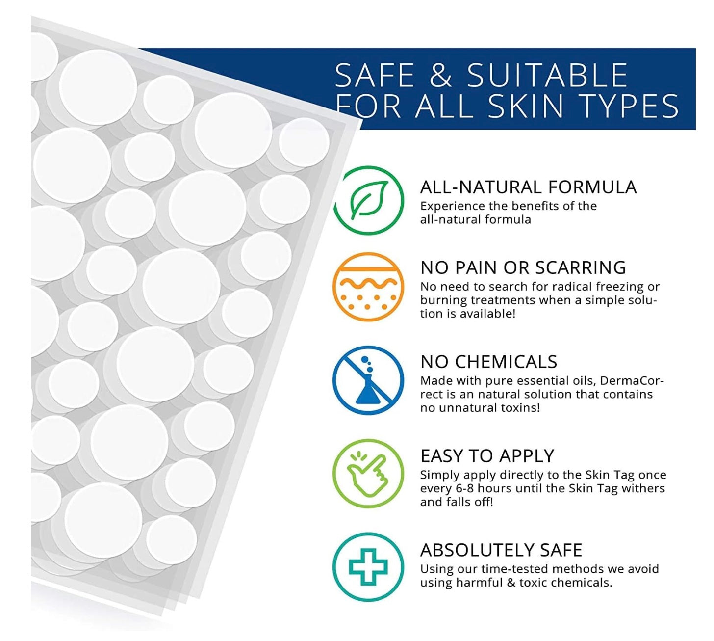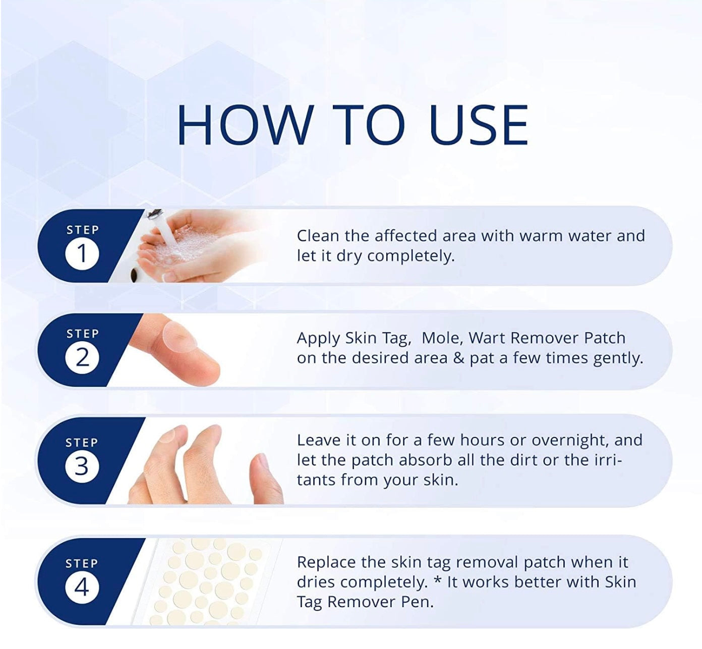 ⏰ Leave the patch on for 8–12 hours. After that, remove and replace with a fresh patch. Continue until the skin tag dries out and falls off naturally.